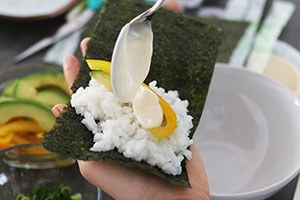2. Laat in aan de linker bovenkant een hoekje vrij van rijst. Neem nu de paprika en avocado en leg deze schuin in het midden. Voeg hierbij een beetje mayo en wat zalmblokjes. Nu rol je de temaki dicht, zodat onderin een punt ontstaat. De bovenkant blijft dan open. Maak af met wat lente-ui en sesamzaadjes. Lekker met wat sojasaus of wasabi.