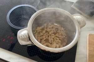 1. Zet een middelgrote pan op het vuur. Verhit de kokosolie op middelhoog vuur en voeg de vegan kipstukjes toe. Bak 1-2 minuten en voeg dan de geraspte gember en knoflook toe. Roer er goed doorheen en bak kort mee.