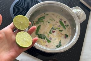 4. Snijd de limoen doormidden, knijp het sap eruit en voeg toe aan de soep. Doe ook de sojasaus erbij. Roer goed door.