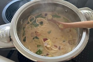3. Giet de groentebouillon en kokosmelk in de pan en verlaag het vuur. Voeg de udon noedels toe en kook de soep 5-6 minuten, tot de groenten zachter zijn en de noedels gaar.