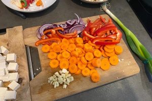 2. Snijd de bloemkool in roosjes, de winterpenen in dunne plakjes, de paprika in reepjes en de tofu in blokjes.