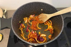 5. Voeg de rode curry pasta, kurkuma en eventueel wat chilivlokken, peper en zout toe en bak dit een paar minuten mee. Voeg een scheut water toe om aanbranden te voorkomen.