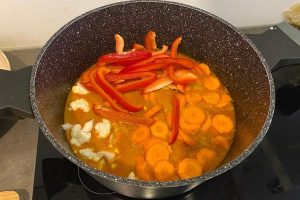6. Doe de bloemkoolroosjes, winterpeen en rode paprika in de pan en bak het een paar minuten mee. Schep het goed om zodat de kruiden goed verdeeld worden.