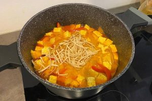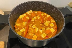 7. Giet de kokosmelk en groentebouillon in de pan en leg de tofublokjes erin.