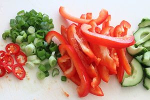 1. Snijd de ananas in stukjes. Snijd de komkommer door de lengte doormidden en schraap met een lepeltje wat van het waterige gedeelte eruit en snijd in plakjes. Snijd de paprika in dunne reepjes.