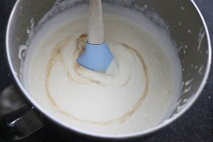 1. Klop de slagroom net niet stijf. Giet de gecondenseerde melk en de mascarpone er bij en mix er door. Giet de afgekoelde koffie en Amaretto er bij en mix nog even kort door.