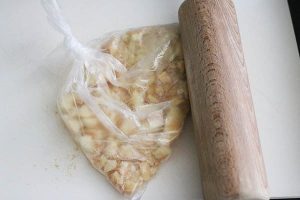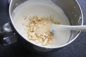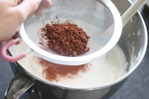 2. Leg 2 lange vingers apart en breek de rest in stukjes. Dus kan makkelijk door ze in een zakje te doen en er met een deegroller op te slaan. Schep door het roommengsel. Zeef het grootste deel van het cacaopoeder erbij en roer als laatste er door.