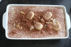 3. Giet het mengsel in een schaal of bak. Verdeel de laatste lange vingers erover in stukken en zeef de rest van het cacaopoeder er over. Laat het tiramisu ijs minimaal 6 uur opstijven in de diepvries.