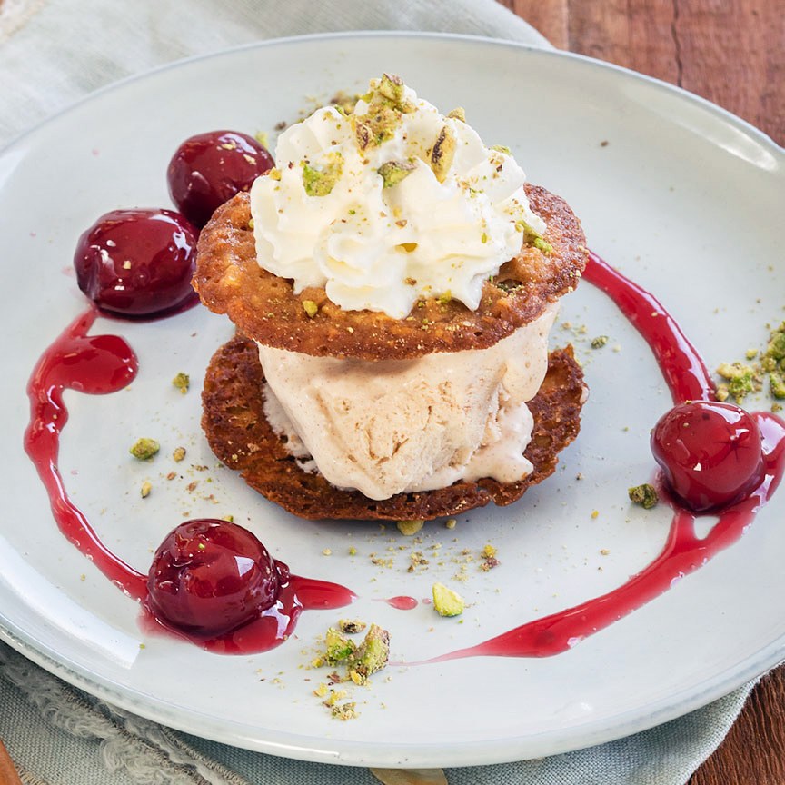 5. Leg de helft van de kletskoppen op bordjes. Schep hier een bol ijs op. Dek af met een andere kletskop. Druppel wat kersensaus en wat hele kersen rondom. Spuit wat slagroom er bovenop en garneer met wat fijngehakte pistachenoten.