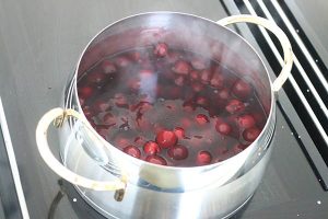 4. Voeg dan ook de kersen toe en verwarm mee. Laat het mengsel indikken tot gewenste sausdikte.