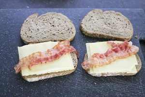 1. Leg 4 sneetjes brood op een werkblad. Beleg deze met een plak kaas, gebakken spek, plak ananas en schep er 2 eetlepels zuurkool op. Leg de andere sneetjes brood er op en druk iets aan.