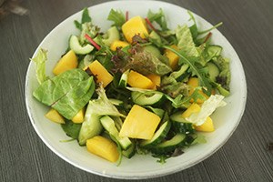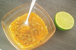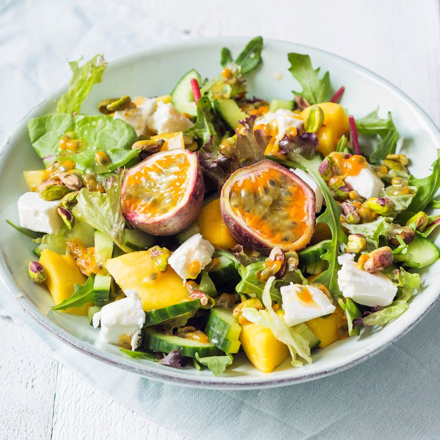 5. Snijd de andere 2 passievruchten open en leg deze op de salade. Besprenkel de salade met de passievruchten dressing.