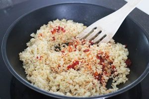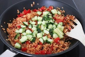 2. Zet het vuur uit en schep de bulgur door het tomatenmengsel. Breng op smaak met een snuf zout, paprikapoeder en eventueel wat chili. Snijd de tomaten en komkommer in blokjes en schep door de bulgursalade.