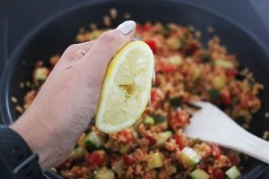 3. Rasp de citroen en pers uit, voeg 1 eetlepel rasp en 2 eetlepel citroensap toe aan de bulgursalade. Hak de bosui in ringetjes en de peterselie fijn en schep er op het laatst doorheen.