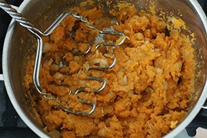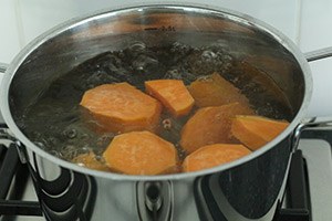 1. Schil de zoete aardappels en snijd ze in stukjes. Kook deze 15 minuten.
