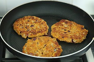 Prak ze vervolgens samen met de kikkererwten en cannelonibonen met een aardappelstamper tot een puree. Snijd de rode ui fijn en voeg deze met de havermout, ei, paprikapoeder, Italiaanse kruiden, peper, zout, cayennepeper en peterselie toe aan het zoete aardappelmengsel. Kneed door elkaar. Vorm er vijf burgers van. Verwarm wat boter in een pan en bak de burgers op een middelhoog vuur aan beide kanten gaar.