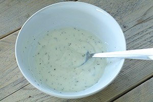 2. Meng ondertussen de ingrediënten voor de yoghurtsaus door elkaar en zet aan de kant. Snijd de broodjes doormidden en beleg ze met rucola, plakjes tomaat en komkommer, de burger en de yoghurtsaus.