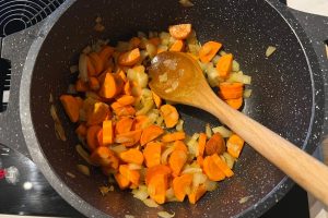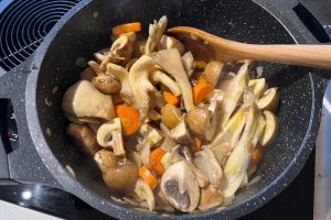 2. Voeg de wortels toe en bak ze 3-4 minuten mee. Voeg vervolgens de champignons en oesterzwammen toe en bak alles nog 5-6 minuten, tot de paddenstoelen zachter worden. Blijf tijdens het bakken goed roeren.