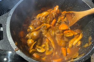 5. Schenk de groentebouillon erbij en roer goed door. Verkruimel de ontbijtkoek boven de pan en roer deze door de stoofpot. De ontbijtkoek zal oplossen en de saus binden.
