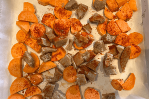 2. Doe de zoete aardappelblokjes samen met de kip op een met bakpapier beklede ovenplaat. Verdeel hier de olijfolie, peper, zout, paprikapoeder en knoflookpoeder overheen.