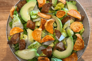 7. Voeg de avocado, croutons, zoete aardappel en kip toe aan de romaine sla en de dressing over de salade heen.