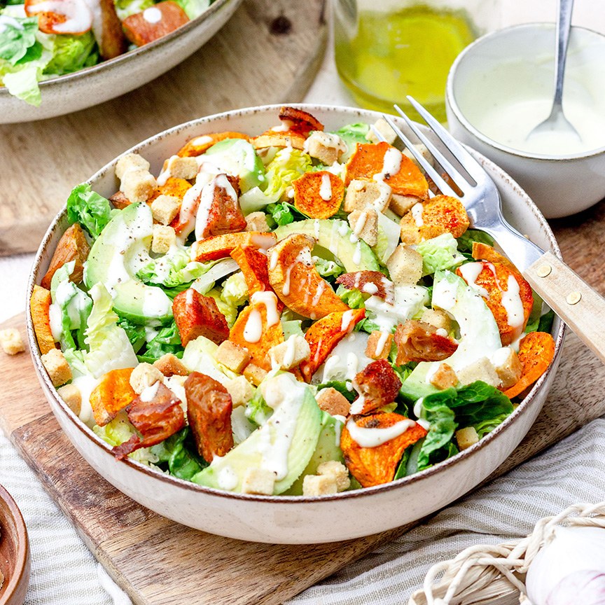 Vegan caesar salade met avocado