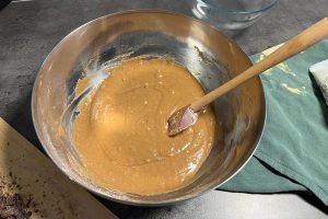 5. Hak de pure chocolade fijn en voeg tweederde toe aan het beslag. Schep de chocolade goed door het beslag heen.