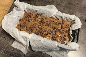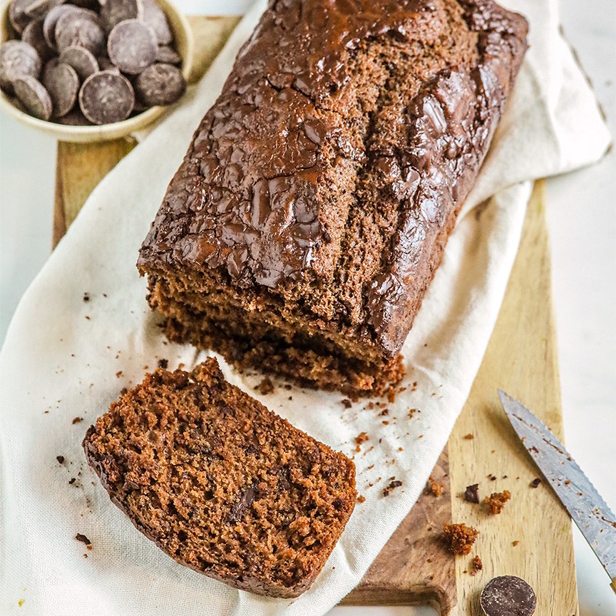 6. Giet het beslag in de cakevorm en verdeel de rest van de chocolade over de cake heen. Zet de cakevorm daarna in de oven en bak de cake in 50-55 minuten gaar, of tot een satéprikker er schoon uitkomt.
