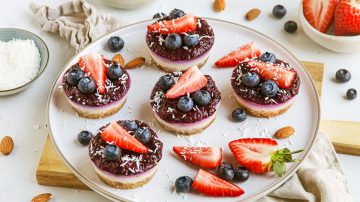 4. Voeg de amandelmelk, citroensap en vanille-extract toe aan de gesmolten boter. Mix het door elkaar en giet het vervolgens bij de droge ingrediënten. Schep de ingrediënten door elkaar, tot een glad beslag.