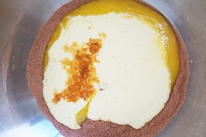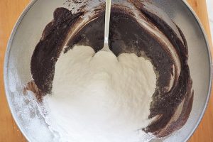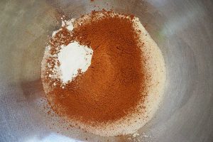 3. Zeef de bloem in een kom. Voeg hier de suiker, cacaopoeder, bakpoeder, baksoda en een snuf zout aan toe. Meng dit tot een geheel.