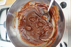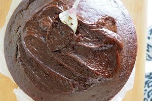 6. Doe voor de topping de pure chocola en de boter in een kom en smelt deze samen au bain-marie. Zodra deze volledig gesmolten is, roer de poedersuiker erdoorheen tot een romige massa.