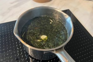 2. Ga verder met de ‘coquilles’. Verwarm het water in een steelpannetje. Scheur de norivellen in grote stuken en snijd de knoflook in plakjes. Doe de stukjes norivellen, knoflook en misopasta bij het water in de pan.