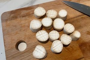 3. Snijd dikke plakken van de stelen van de koningsoesterzwammen, ongeveer 3 cm dik. Snijd daarna kleine inkepingen in deze coquilles. Snijd de rest van de paddenstoel, die je overhoudt, in kleine stukjes en voeg deze toe aan de pan met water. Laat de pan met water en de andere ingrediënten op een laag vuurtje, ongeveer 10 minuten, staan. Zo maak je eigenlijk je eigen bouillon. Dit kun je later dus ook nog makkelijk bewaren.