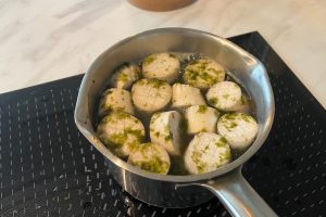4. Haal de pan van het vuur en leg hierin alle ‘coquilles’. Laat ze 15 minuten weken zodat ze alle smaken van de bouillon opnemen.