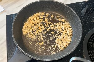 5. Hak ondertussen het andere takje rozemarijn fijn en hak de hazelnoten grof. Zet een koekenpan op het vuur en rooster de rozemarijn en de hazelnoten een paar minuten op hoog vuur zonder olie of boter.
