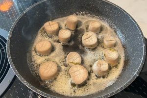 8. Leg de coquilles in de hete boter en bak ze goudbruin. Draai ze na een paar minuten om en bak ze nogmaals even aan de andere kant.