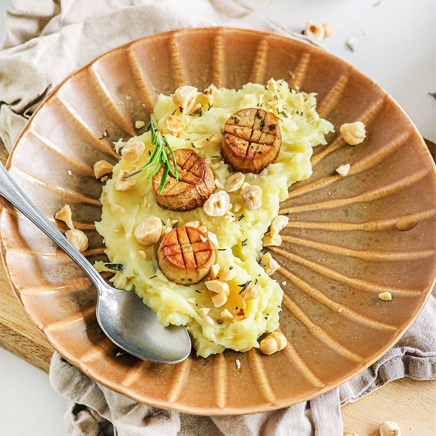 9. Verdeel de puree over de borden en leg er de coquilles bovenop. Strooi de geroosterde hazelnoten en rozemarijn over de coquilles en voeg eventueel nog een beetje zwarte peper toe naar smaak.
