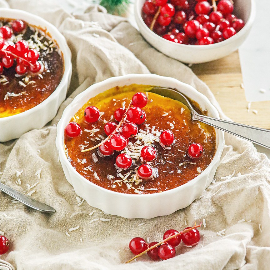 4. Serveer meteen en garneer met rode bessen en geraspte kokos.