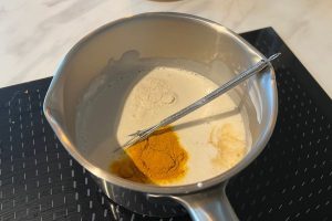 1. Zet een steelpannetje op het vuur en giet de kokosmelk erin. Voeg de kurkuma, agar agar, 3 eetlepels suiker en de vanille-extract toe en verwarm het op een middelhoog vuur tot het begint te bubbelen. Roer het goed door met een garde.