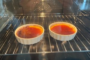 3. Strooi net voordat je ze wilt serveren de rest van de suiker over de crème brûlée en zet ze daarna nog kort onder de grill of karamelliseer de suiker met een gasbrander.