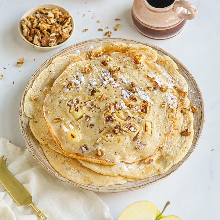 6. Leg de pannenkoeken op een bord en leg er een ander bord bovenop om deze warm te houden. Herhaal met de rest van het beslag het bakproces en bak alle pannenkoeken tot het beslag op is.