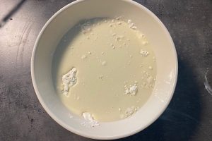 2. Giet vervolgens de sojamelk erbij en meng het tot een geheel.