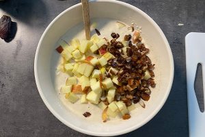 3. Snijd de appel in kleine blokjes en meng deze samen met de rozijnen door het beslag heen.