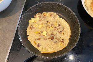 5. Giet een soeplepel met het beslag in de pan en bak de pannenkoeken 2-3 minuten per kant goudbruin. Voeg telkens wat extra boter toe aan de pan om nieuwe pannenkoeken te bakken.