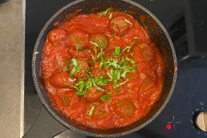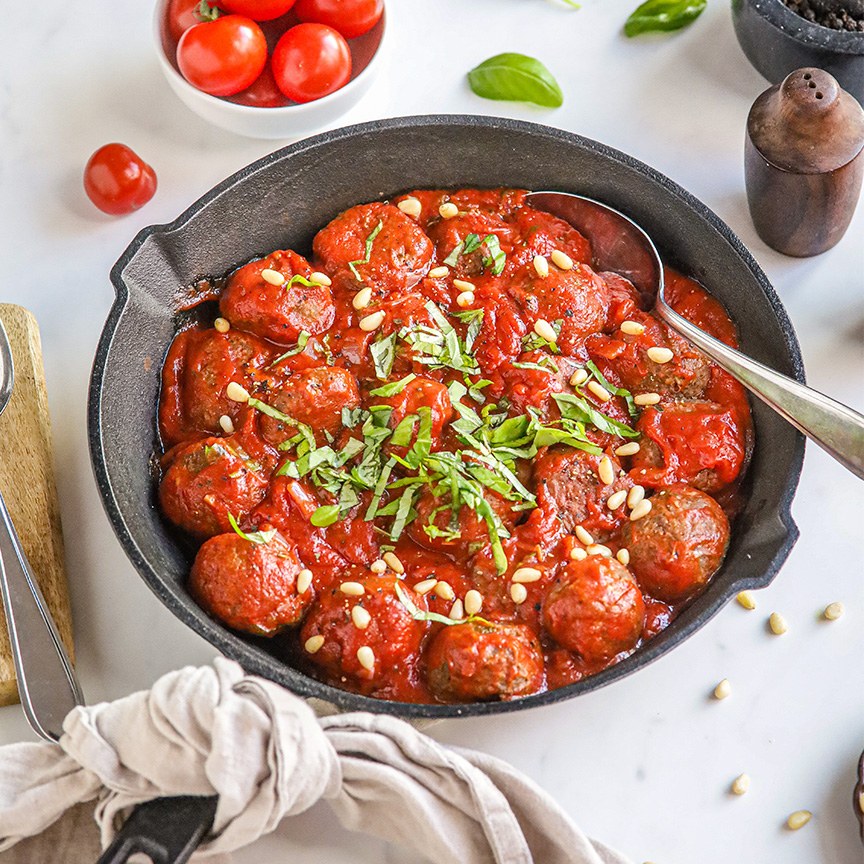 15. Haal de balletjes uit de oven en leg ze in de tomatensaus. Roer het voorzichtig door en garneer vervolgens met fijngehakte basilicum en eventueel nog wat geroosterde pijnboompitten.
