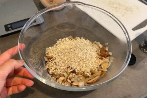 5. Doe het kastanjechampignonmengsel in een kom en voeg daar de bruine linzen, havermout, komijnpoeder, verse peterselie, sojasaus, peper en zout aan toe.