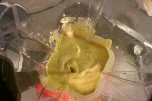 3. Doe de geweekte cashewnoten, tenen knoflook, edelgistvlokken, plantaardige melk, mosterd, kurkuma, chillivlokken, zout en een snufje zwarte peper in de blender en mix het tot een dikke, romige en gladde saus.