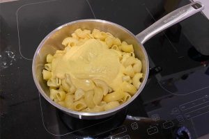 4. Giet de saus bij de macaroni in de pan en verwarm het in z’n geheel tot het de gewenste temperatuur heeft.
