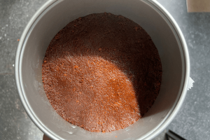 4. Plaats bakpapier op de bodem van de springvorm en druk hier het koekjes mengsel op plat. Druk dit aan met de onderkant van een glas of lepel.