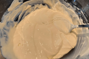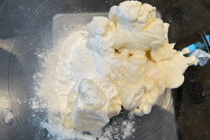 6. Klop de plantaardige roomkaas los samen met de vanillesuiker en poedersuiker.